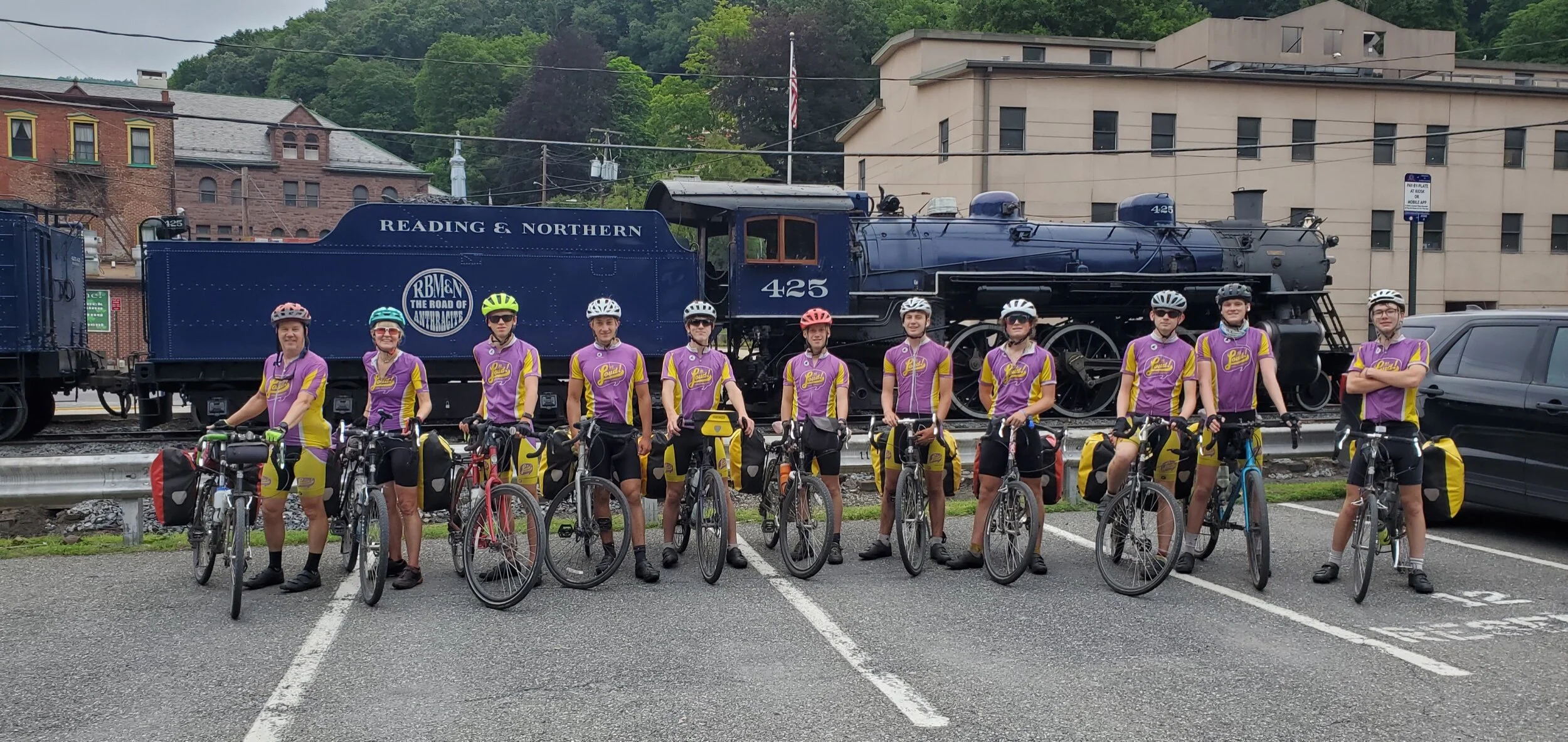 Halfway through this portion, we reached the Virginia border sign! We hoisted Daniel up to the top of the sign to put a Bikeloud sticker as high as we could. After taking a short break at the sign, we finished our last few miles and arrived at the Suffolk fireman union which is where we are staying the night. After dropping off our stuff, we all made free Planet Fitness day passes to use their showers. Once we were all clean, we split up for dinner and started winding down for the night. We made lots of homemade snow cones, saw a train, and hit the hay. Century day tomorrow!