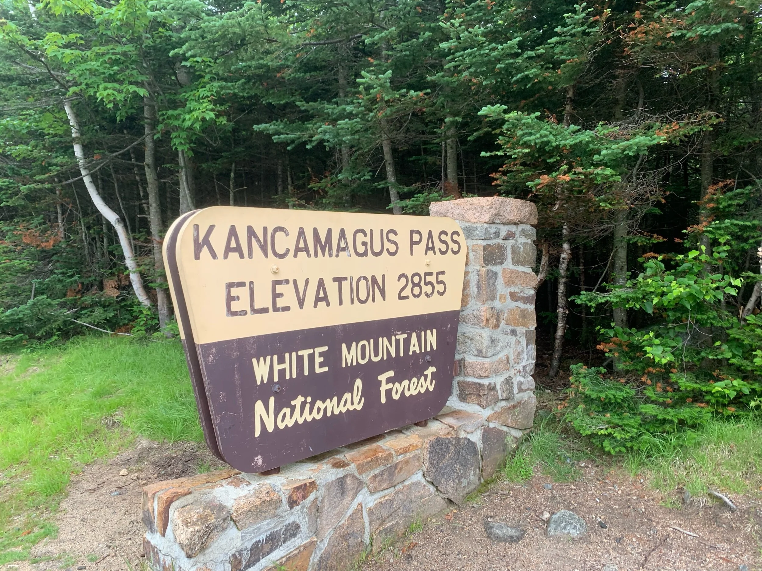 We continued up the road for 8 miles to a gas station to stock up before the second pass. Just a mile down the road was the New Hampshire border, there were two signs so we put a bike loud sticker on both. I was expecting the pass to be much harder than it was, it was about 16 miles uphill but it was not extremely steep until the last 5 or so. There was a gorgeous view at the top of the pass just off the road with a lake and many mountains all around. We stopped there for me to get a knee brace out of my bag and for Evan to replace his inner tube which had been slowly leaking all day. We met a group of nice people there and explained the trip to them.