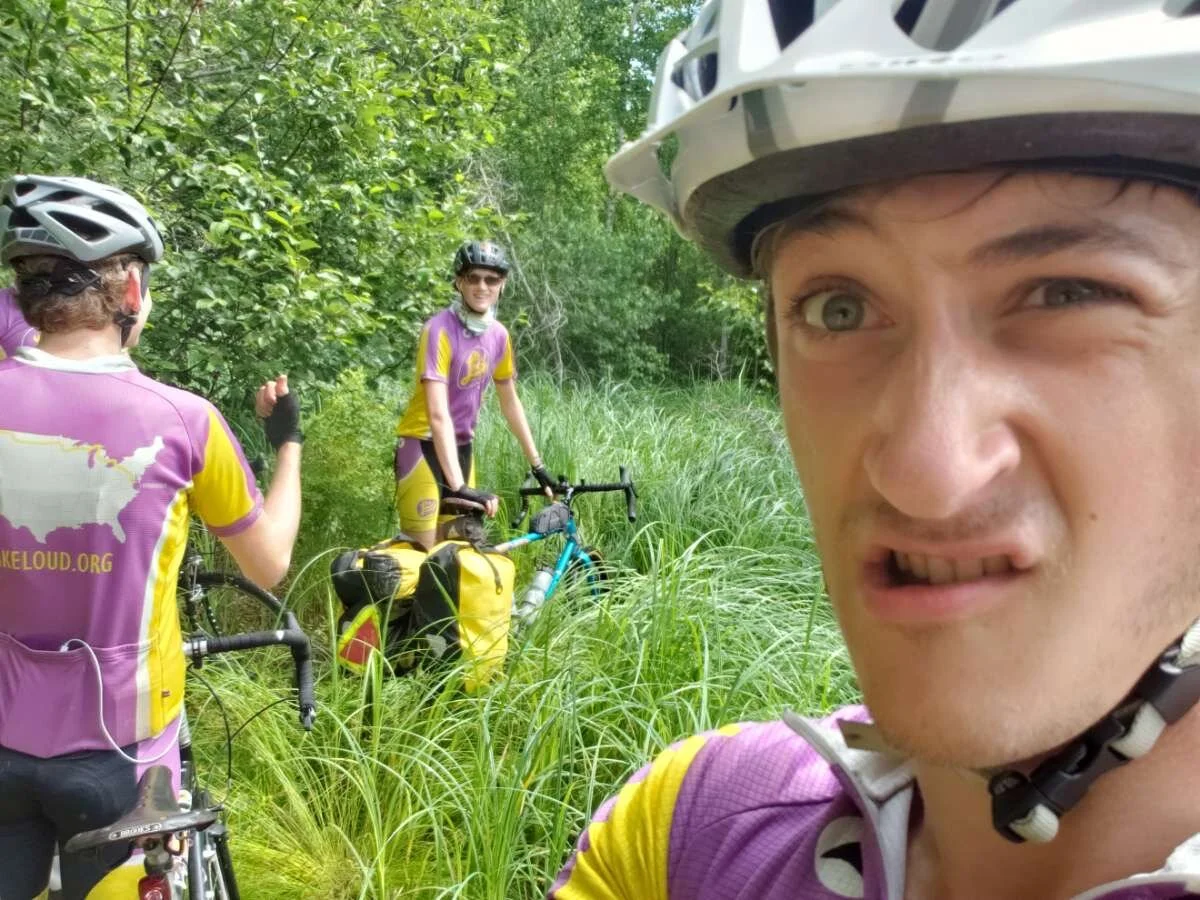 After breakfast things got a little wild. We had a 20 mile ride to the next gas station for a break and decided to try and take a shortcut from the highway and stay off of the busy road. We hopped on a dirt trail and blew past the dead end sign. A bad move on our part. Because of the severe rainstorms from yesterday, the trail had eroded into chaos. We flew down a steep downhill dodging big rocks and sinking into the heavy mud. We quickly arrived at a no trespassing fence blocking our way. We called the number on the sign and the owners thankfully allowed us to keep moving past the fence. We walked our bikes around the fence through some bushes and kept moving. We found the trail quickly becoming denser with trees and wildlife until we were completely surrounded by a jungle. There no longer was a trail, and the almost unrecognizable path in front of us had turned into a swamp with water going about a foot deep. With no other choice, we waded our way through the swamp with our bikes, submerging our legs in the water. Truly a miserable experience. We eventually passed through the swamp and finished out the last of the trail finally arriving at the road once again.
