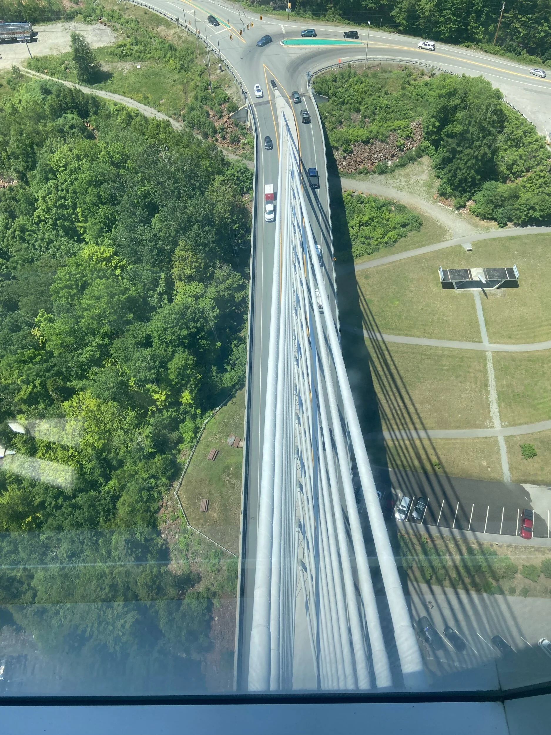 One mile out from the gas station we arrived at Hancock Bridge. Because it was so early, we decided to go to the observatory and ride the elevator up to the top of one of the bridge towers for a nice view. We went through the 30 minute line only to realize we needed to buy tickets to go up and were empty handed. Mr. Hawley went back to get some while we waited at the bottom. We eventually made it to the top and had some amazing scenery. After our excursion, we went to the gas station, had some snacks, and kept on moving.