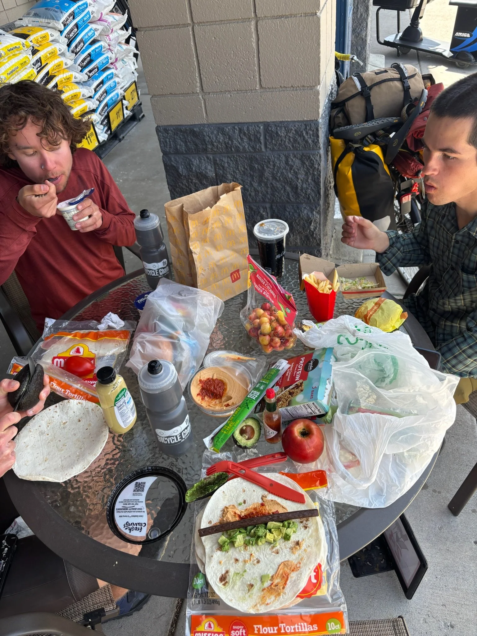 Brian says that our big biking days (like yesterday’s 91-mile day) aren’t as hard on our bodies until the following day. After grocery shopping in town, anyone looking at our lunch table could see that we were trying to recover from war. It’s always interesting to see the meals our group manages to throw together during lunch. Today was no exception. Our spread featured cheeseburgers, sprout and avocado bagel sandwiches, tuna and honey mustard tacos, turkey, hummus and avocado wraps, and many other questionable DIY food concoctions. Lunch is always a great time to laugh at ourselves and lighten the mood after our hard work from the morning.