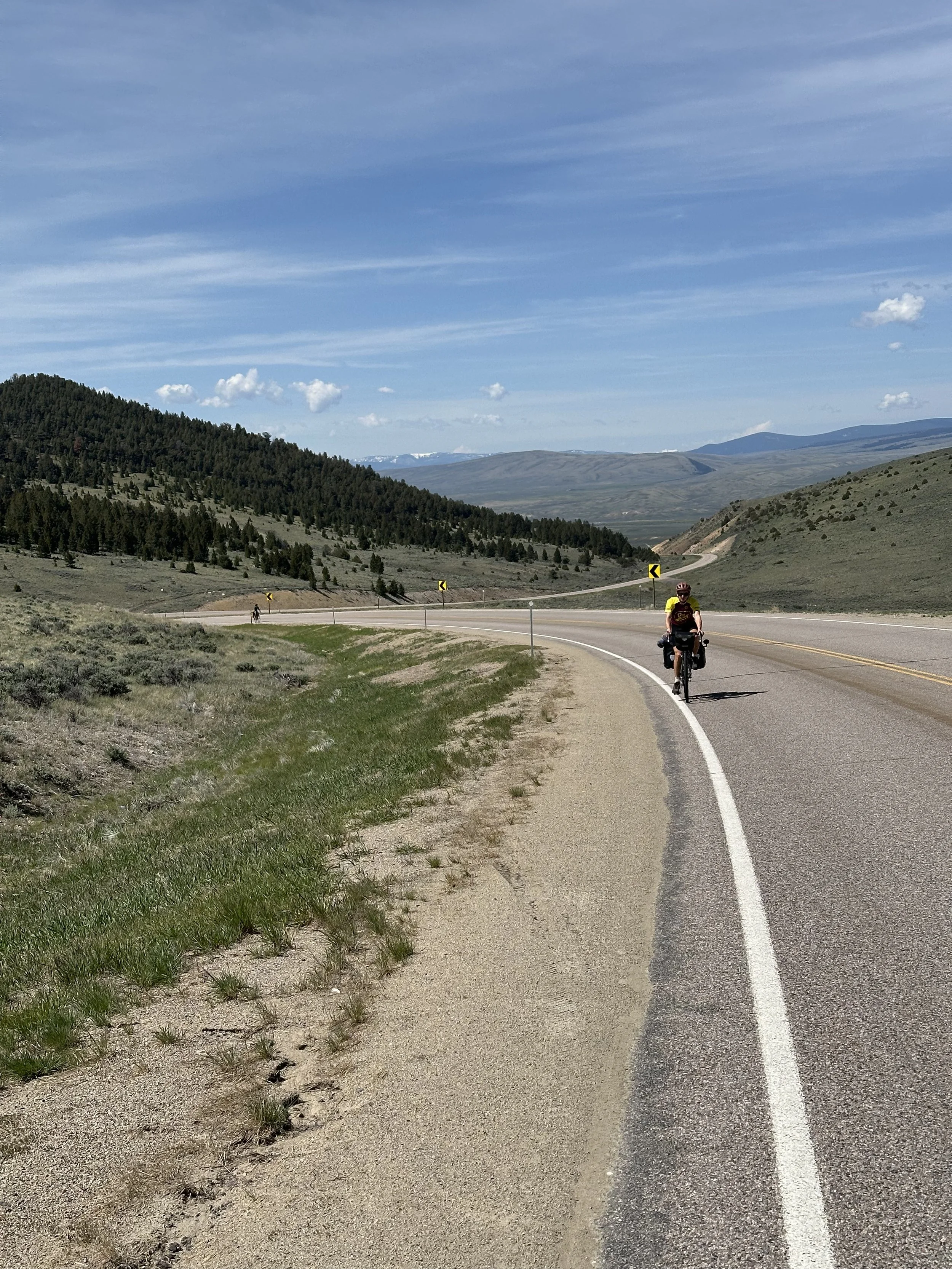 There were two passes and a few flat sections separating us from Dillon. Our first pass of the day met us early and was accompanied by a strong headwind. At the top of the Big Hole Pass we were happy to set another elevation record for our trip: 7,400 feet. This came as a surprise to me since the climb wasn’t very long, but it made sense considering that we started the day at a relatively high elevation in Jackson (6,470 feet).