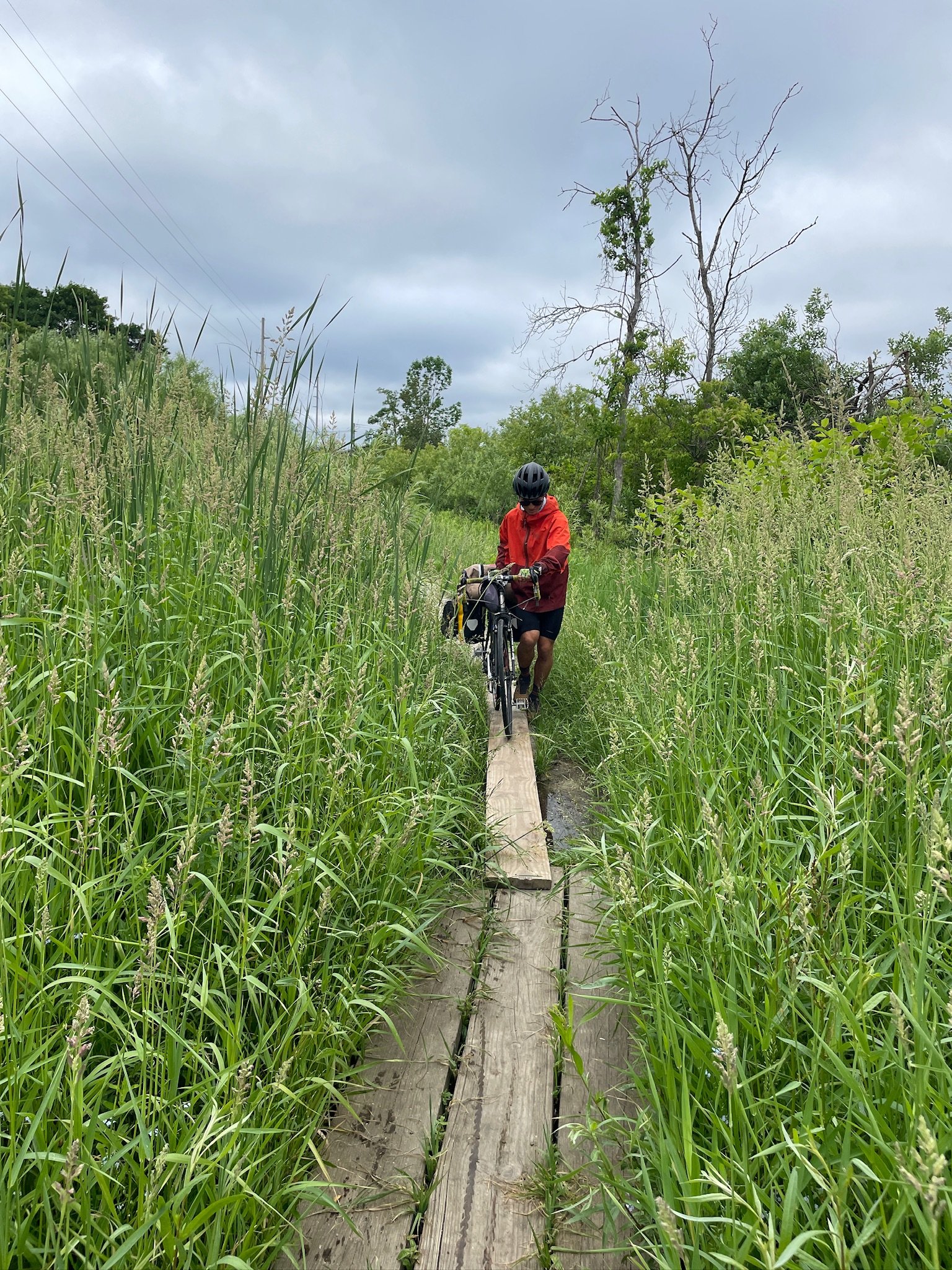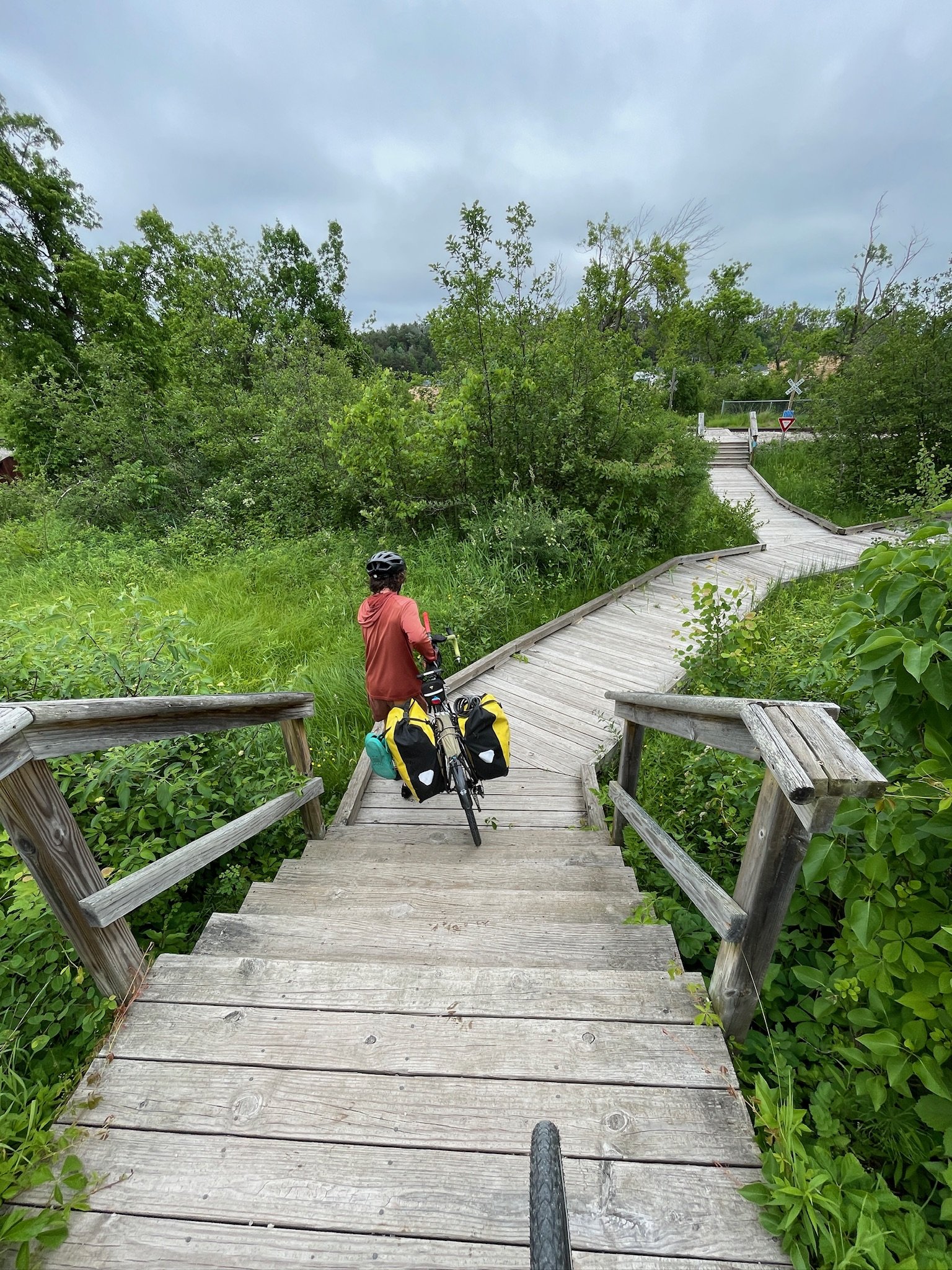 Luckily, there is a bike path all the way from Harbor Springs to Charlevoix and it kept us cruising along the shoreline. We passed by a bustling skatepark and a small airport before stopping in Petoskey to see one of Brian’s friends at Bayfront Park. He stayed with this individual during his 2019 trip, and it took only one message to reconnect—“Wanna jump off the pier with us when we reach town in an hour?” Next thing I know, I’m filming Brian, Jacob, and Marko do front flips into a very cold great lake. Smiling and unphased by a 52° dunk, Marko and Julia offered us a place to stay for the night. Absolutely! Their house was located “just up the hill” and supposedly there was a bike path that would lead us straight to it. Well, we must have made a wrong turn. Pretty soon, we were on rocky single-track and navigating an obstacle course of stairs and bridges. This section gave us our first taste of off-road cycling and we all had a good laugh trying to “walk the plank”. Out of the rain for another night, we’re chowing down on pizza and ice cream, and just enjoying the company of our enthusiastic hosts.