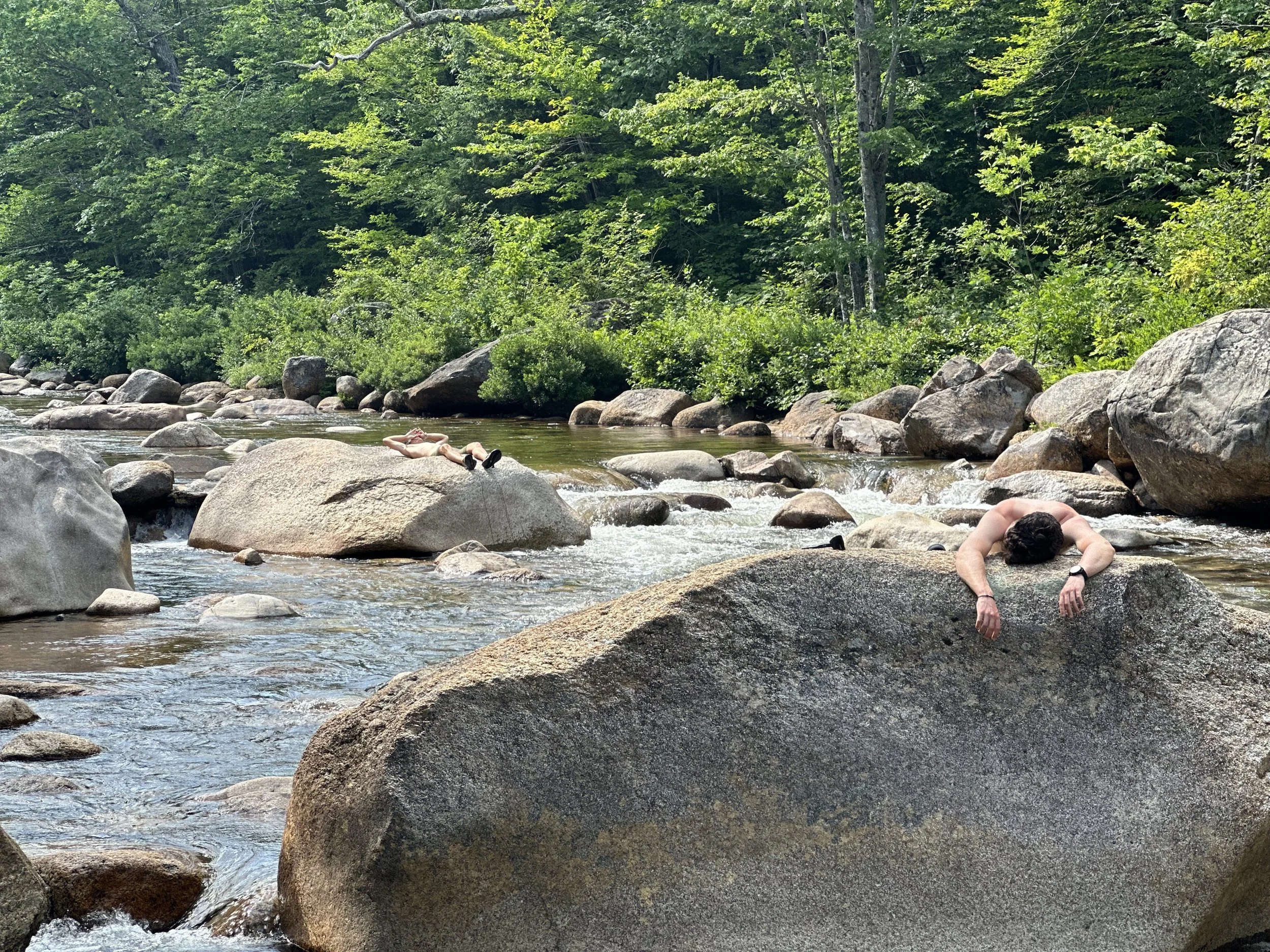 Once safely descended, we took a long lunch break along the Swift River. The cool water soothed our sore legs, and the sun-warmed rocks provided ideal napping surfaces.