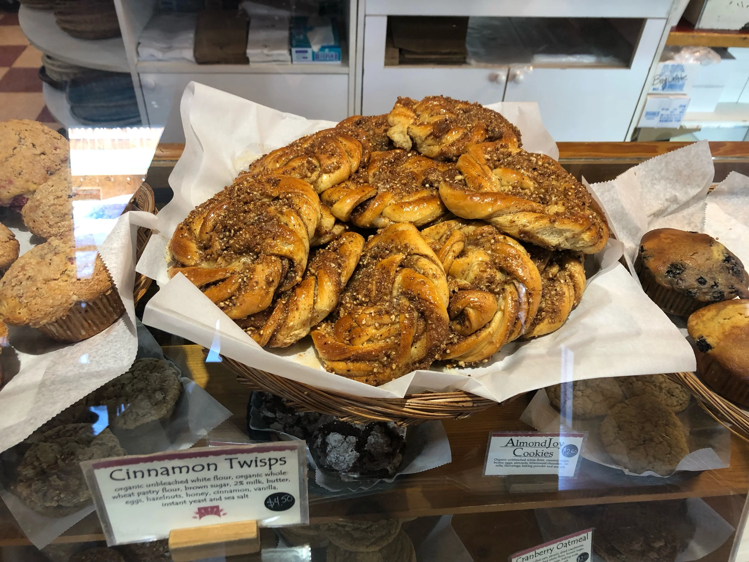 Upon entering the Cinnamon Twisp, I was overcome by the exquisite aroma of fresh-baked sourdough bread, muffins, bagels, and handmade pies. There was a delectable array of baked goods behind the counter, but front and center was the star of the show, a massive platter of cinnamon twisps.